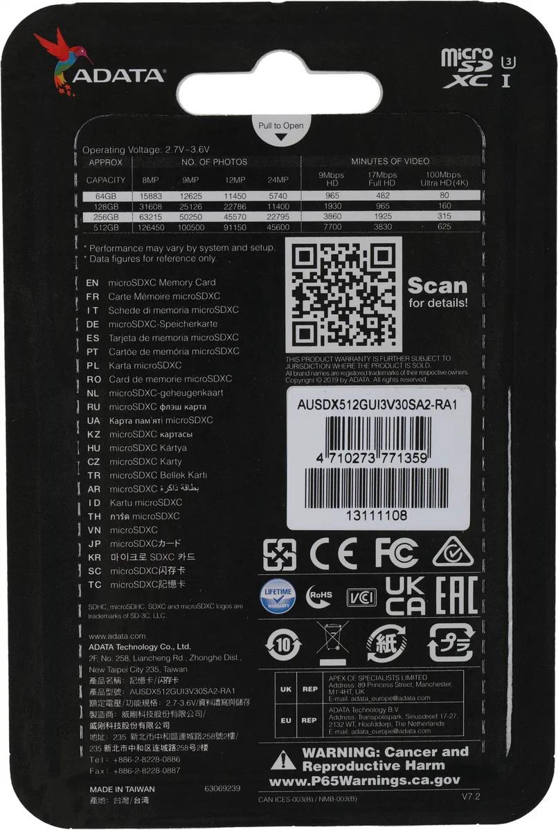 Флеш карта microSDXC 512GB A-Data AUSDX512GUI3V30SA2-RA1 Premier Pro (AUSDX512GUI3V30SA2-RA1)