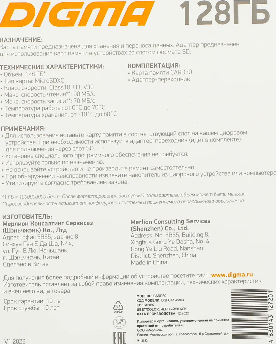 Флеш карта microSDXC 128GB Digma CARD30 V30 + (DGFCA128A03)