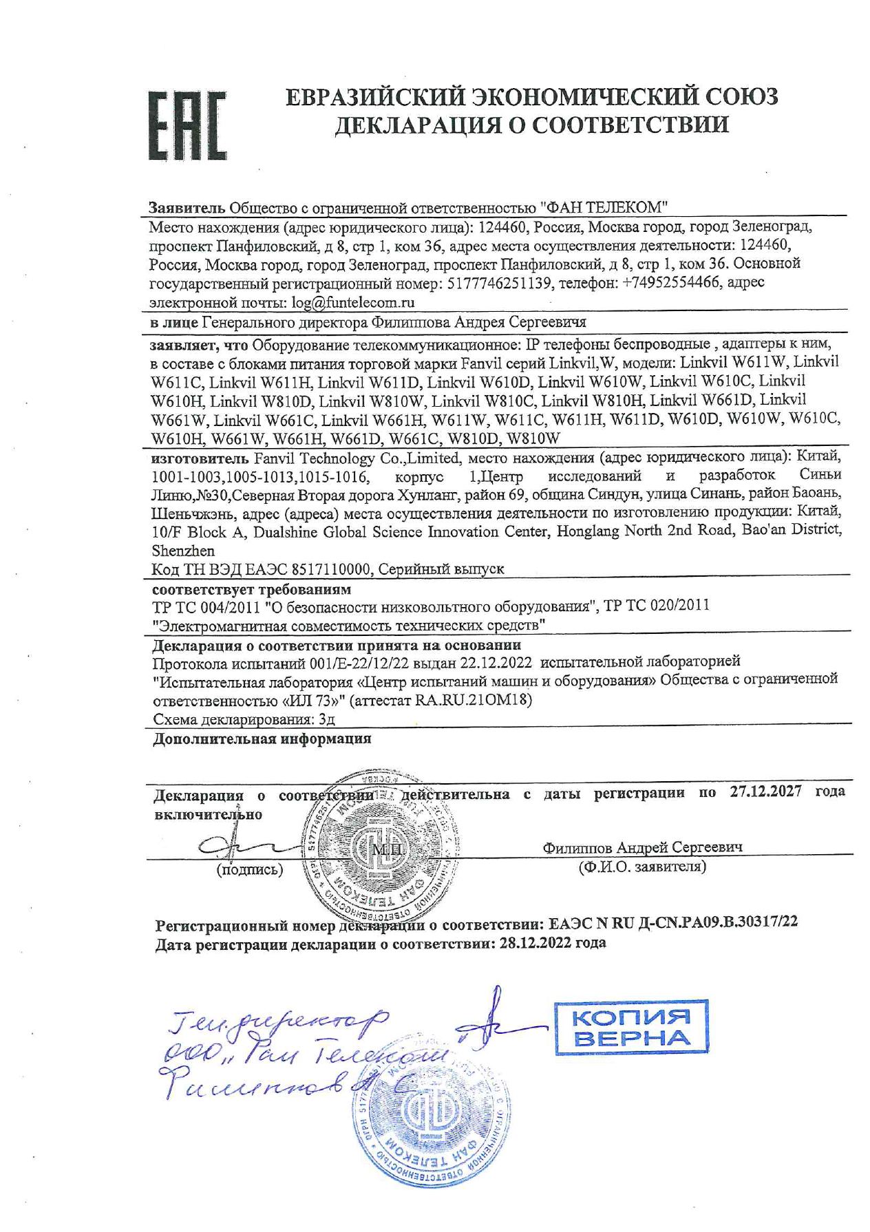 | Телефон IP Fanvil W610H серый | ЕАЭС N RU Д-CN.РА09.В.30317/22 | 27.12.2022 | 26.12.2027 |