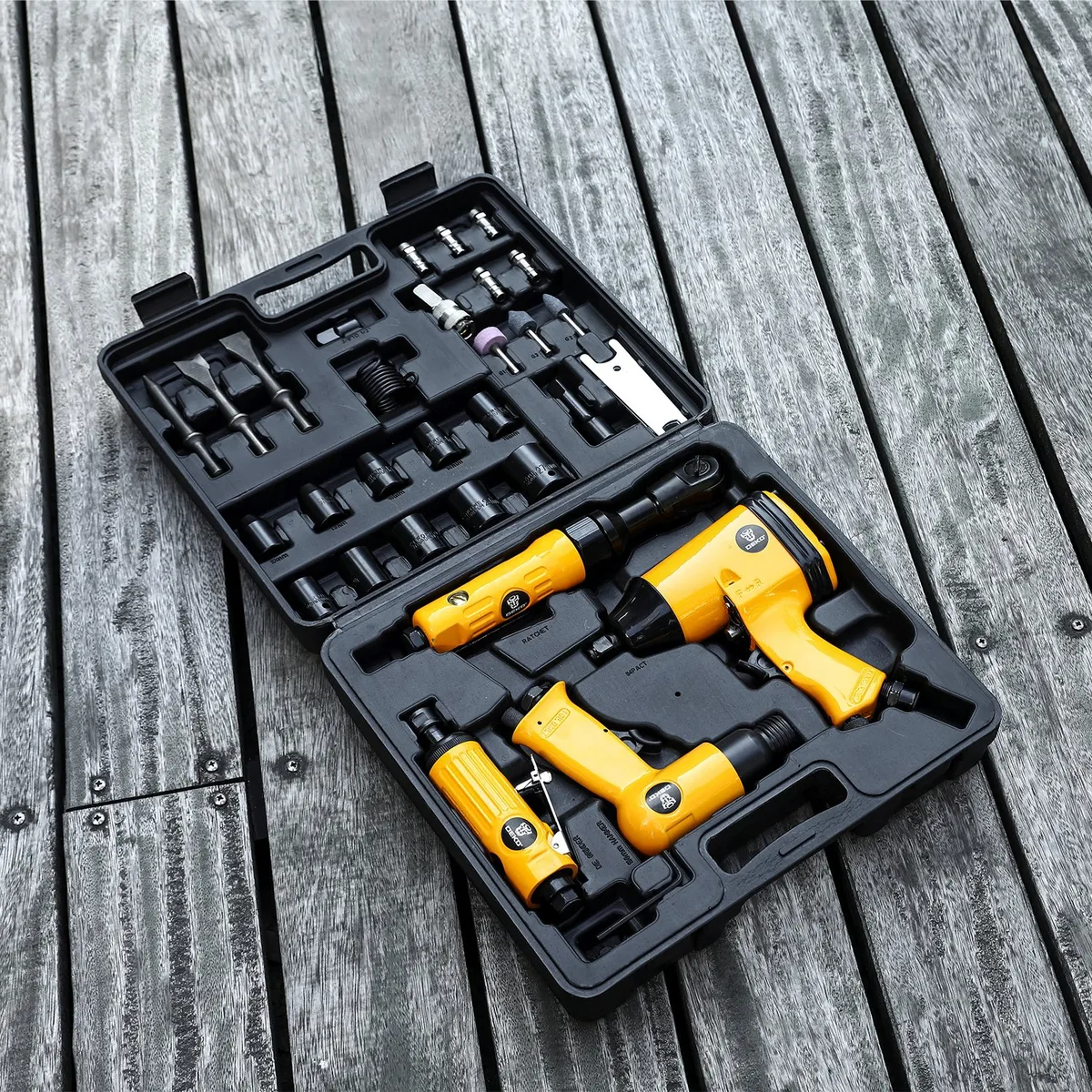 Прямая пневмошлифмашинка, 1/2" ударный гайковерт, пневматическая трещотка 3/8", пневмодолото 150 мм., пружинный фиксатор, 10 х 1/2 " ударных гнезд: 9, 10, 11, 13, 14, 17, 19, 22, 24, 27 мм., 3 х 6 мм. шлифовальные насадки, адаптер с 3/8 на 1/2, шестигранн -
