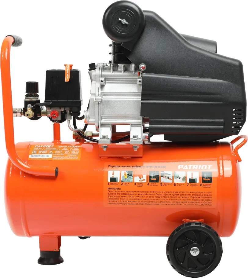 Компрессор Patriot поршневой масляный EURO 24-240K2, 240 л/мин, 8 бар, 1500 Вт, 24 л, быстросъемный 1/4" + "елочка", набор пневмоинструмента KIT 5C