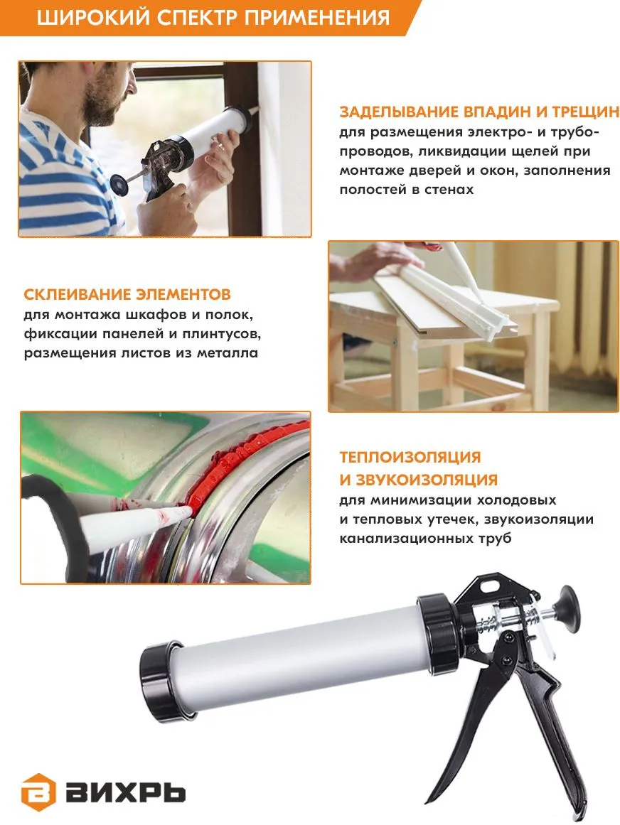 Для монтажных работ. Подходят герметики в картриджах и тубах -