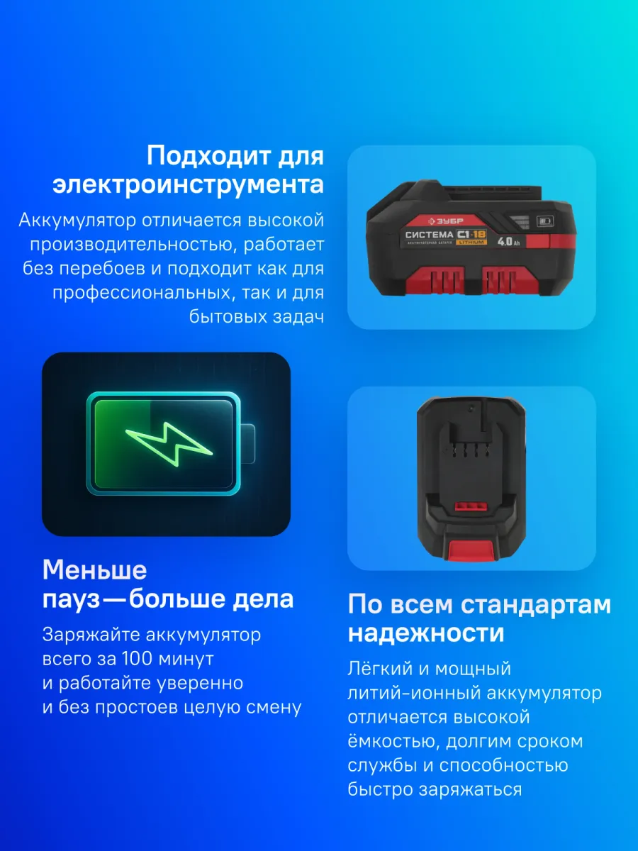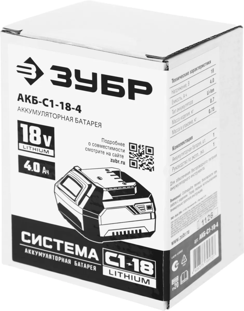 Батарея аккумуляторная Зубр АКБ-С1-18-4 18В 4Ач Li-Ion (АКБ-С1-18-4)