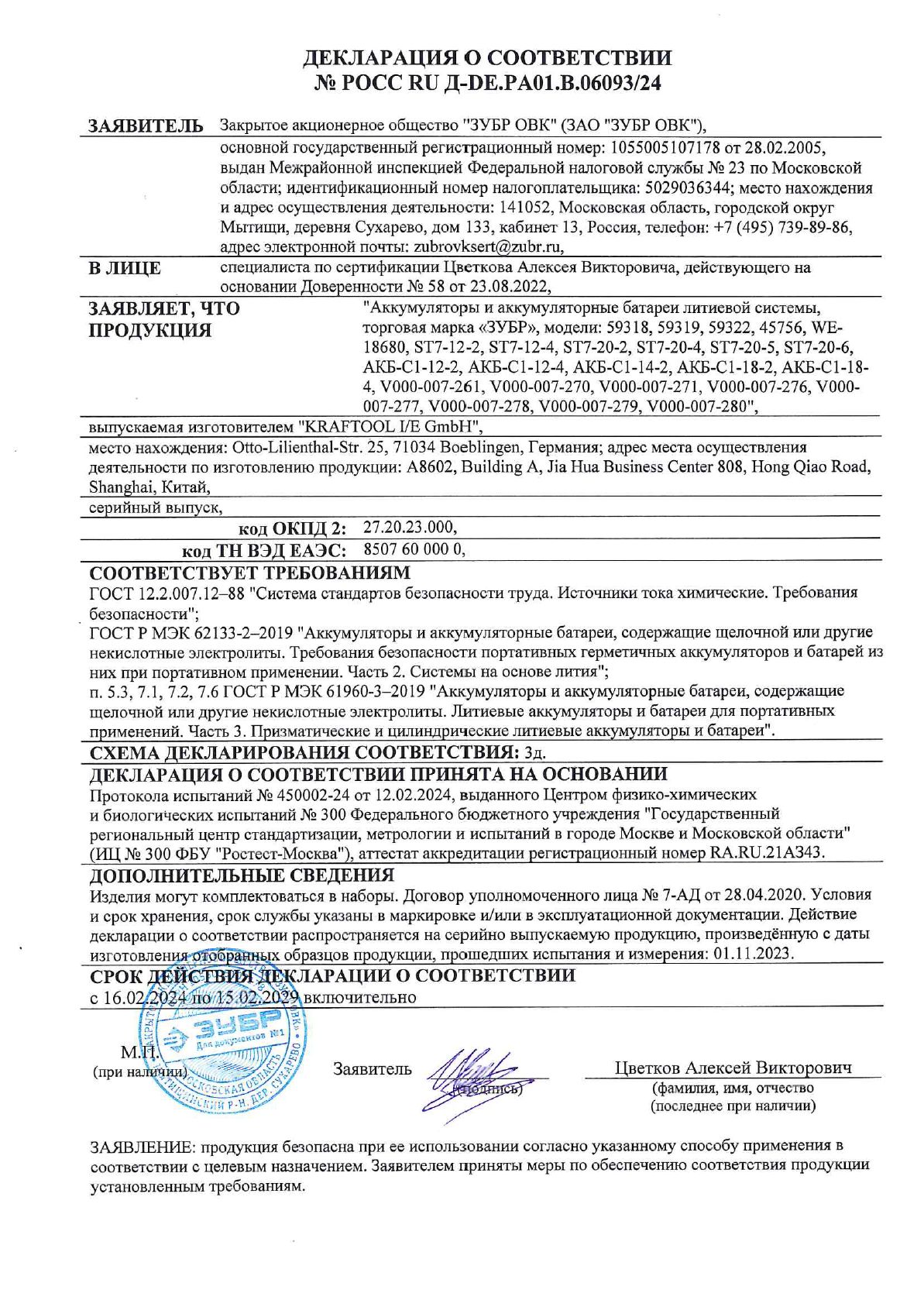 | Батарея аккумуляторная Зубр АКБ-С1-18-4 18В 4Ач Li-Ion | РОСС RU DE.РА01.В.06093/24 | 15.02.2024 | 14.02.2029 |