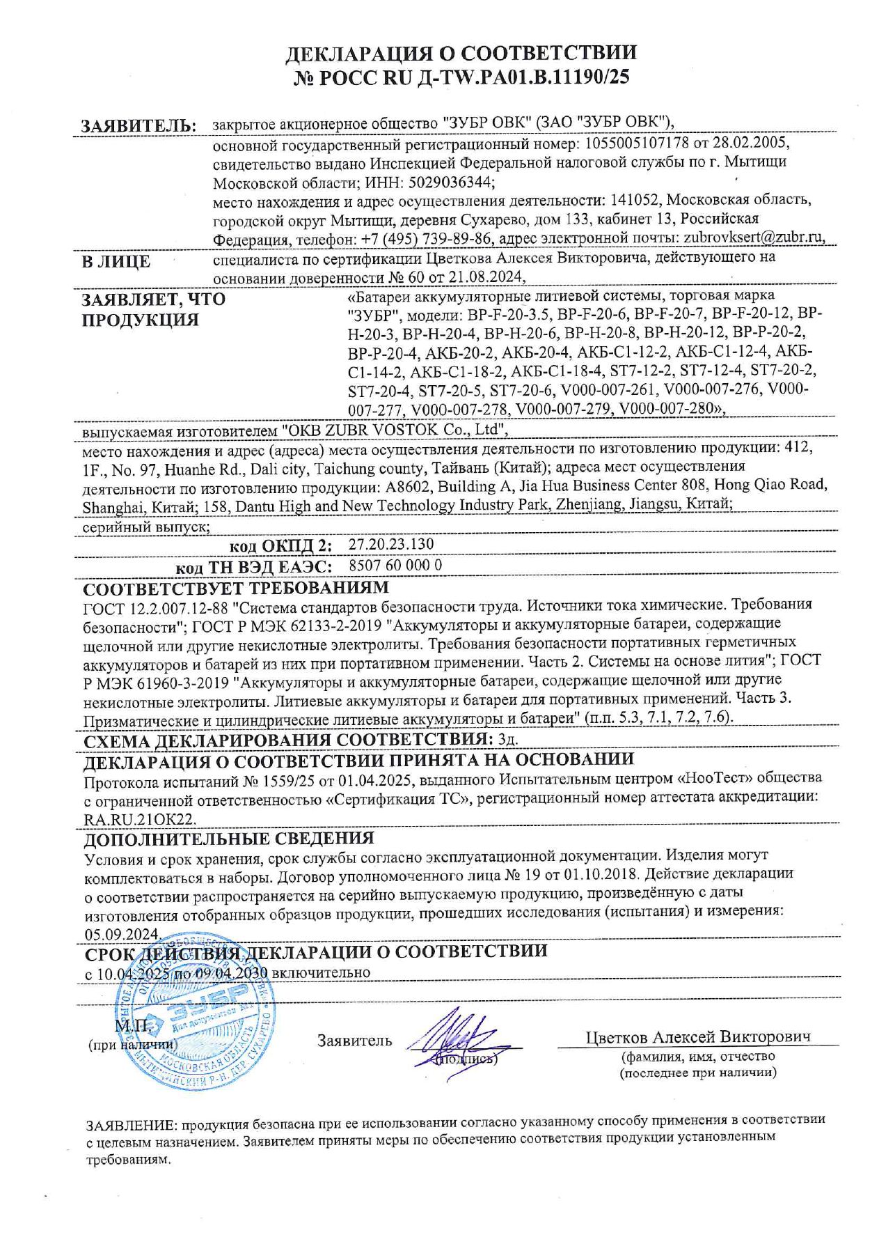 | Батарея аккумуляторная Зубр АКБ-С1-18-4 18В 4Ач Li-Ion | РОСС RU TW.РА01.В.11190/25 | 09.04.2025 | 08.04.2030 |