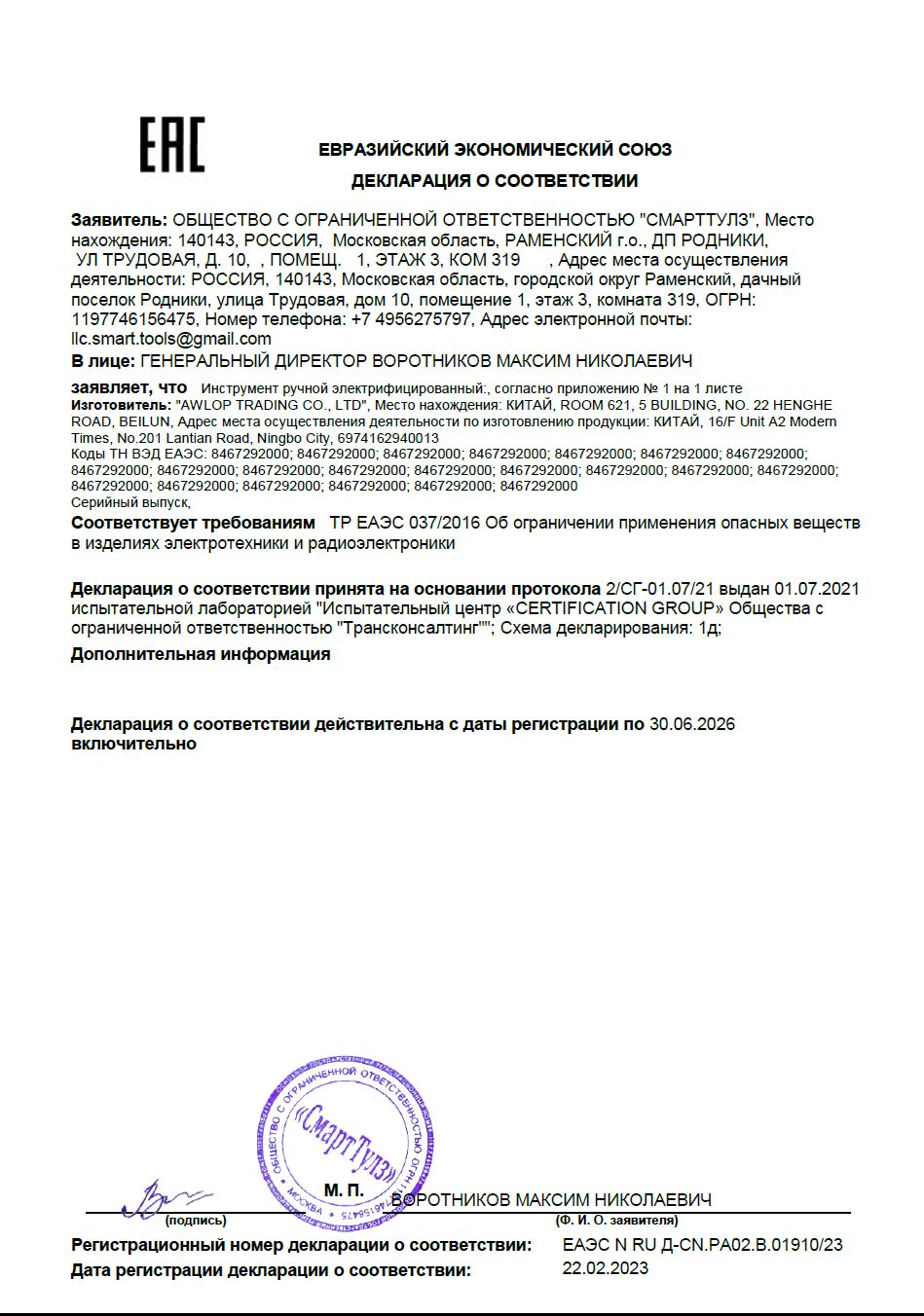 ЕАЭС N RU Д-CN.РА02.В.01910/23 | 21.02.2023 | 29.06.2026 |