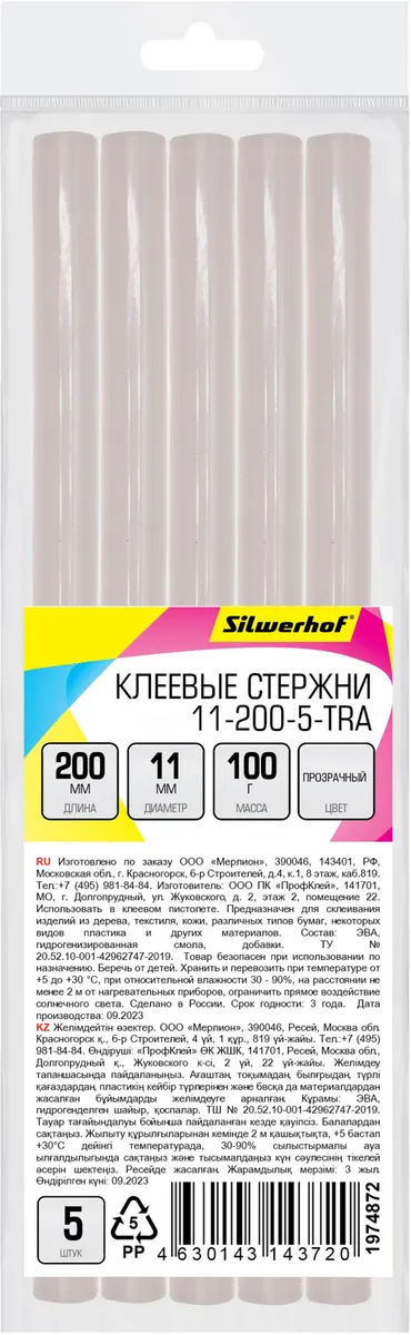 Cтержни клеев. для клеев.пист. Silwerhof 11-200-5-TRA дл.200мм D11мм прозрачный упак:5шт (11-200-5-TRA)