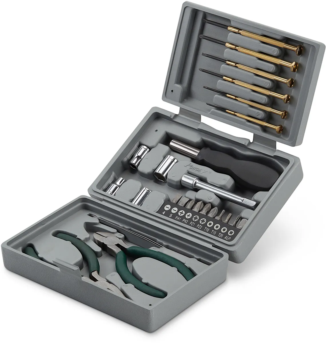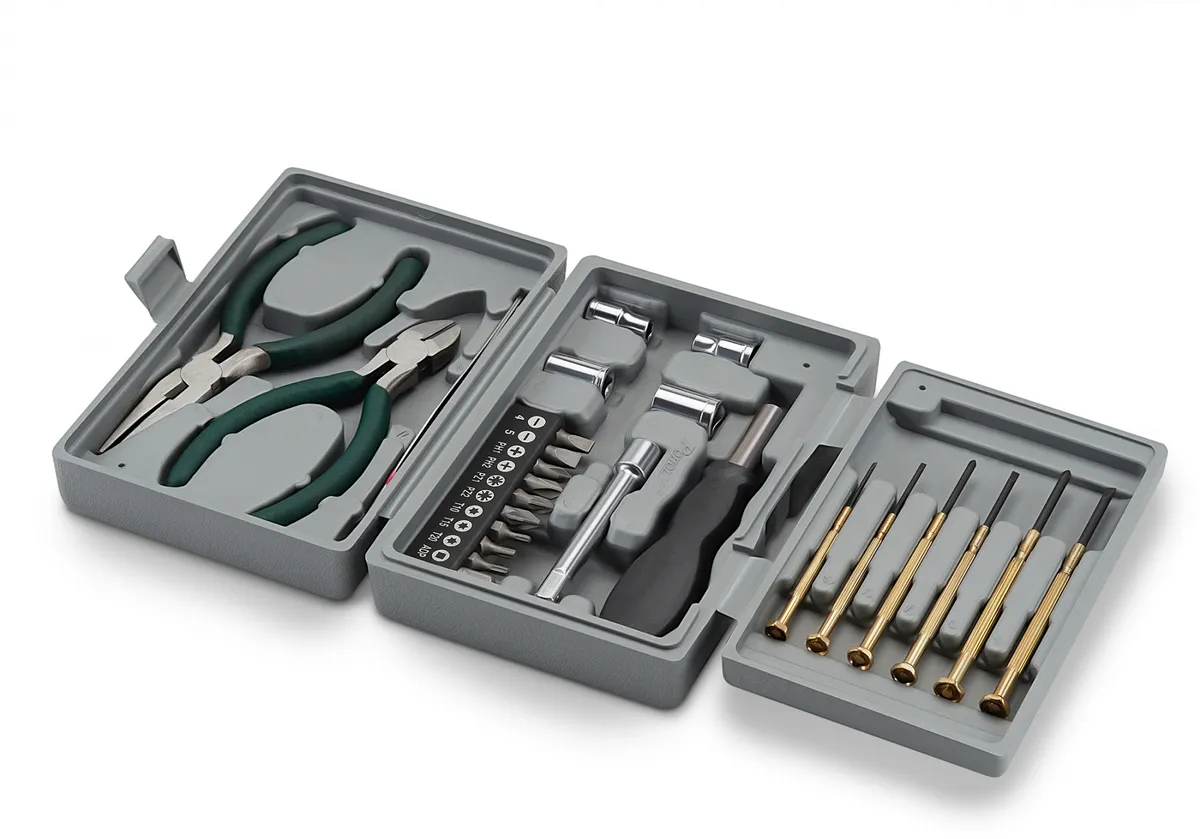В наборе: часовые отвертки, пассатижи, кусачки, торцевые головки, биты, кейс.