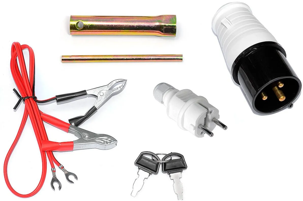 Генератор, аккумулятор, вилка 230В/16А - 1 шт, вилка 230В/32А - 1 шт, документация, клеммы для зарядки аккумулятора, ключи зажигания, ключ свечной. -