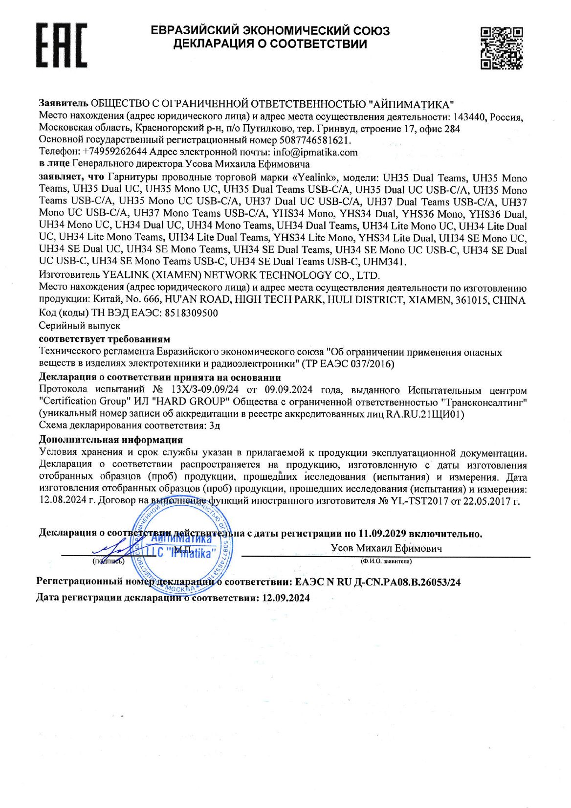 | Гарнитура проводная Yealink YHS34 Dual черный | ЕАЭС N RU Д-CN.РА08.В.26053/24 | 11.09.2024 | 10.09.2029 |