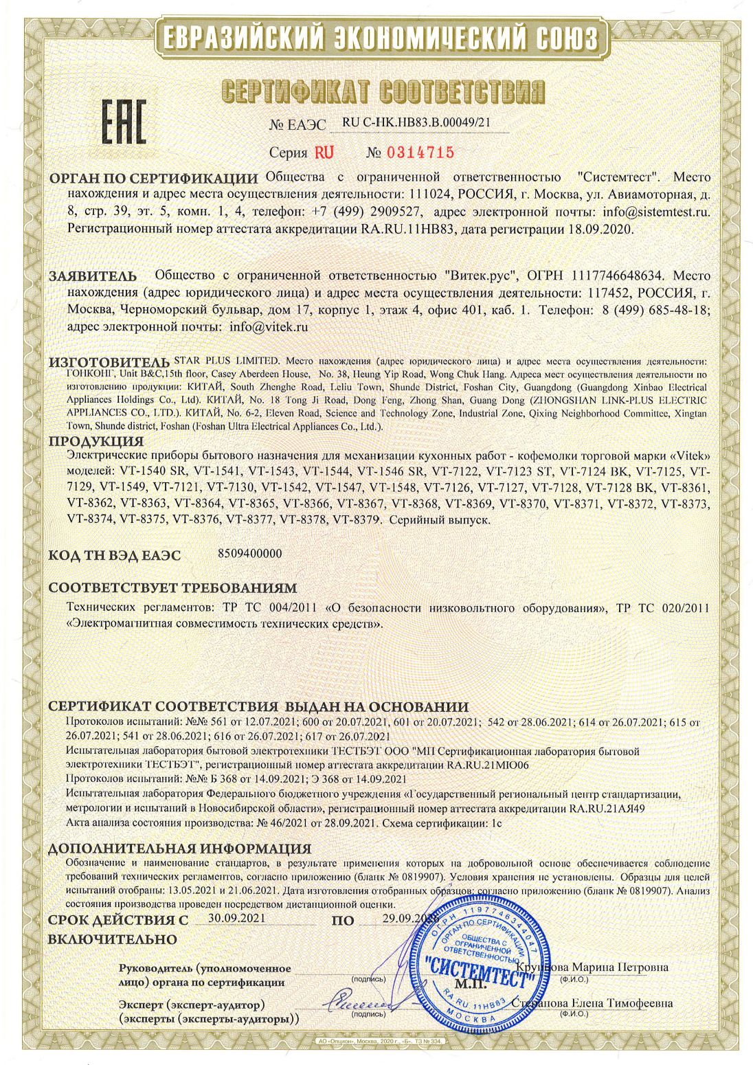 | Кофемолка Vitek VT-7127 200Вт сист.помол.:ротац.нож вместим.:45гр черный | ЕАЭС RU С-HK.НВ83.В.00049/21 | 29.09.2021 | 28.09.2026 |