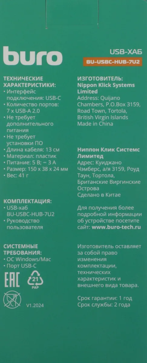 | Разветвитель USB-C Buro BPH-C-P107 7порт. черный (BU-USBC-HUB-7U2) | ЕАЭСД | 12.12.2024 | 11.12.2029 |