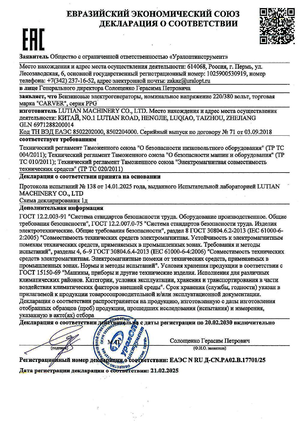 ЕАЭС N RU Д-CN.РА02.В.17701/25 | 20.02.2025 | 19.02.2030 |