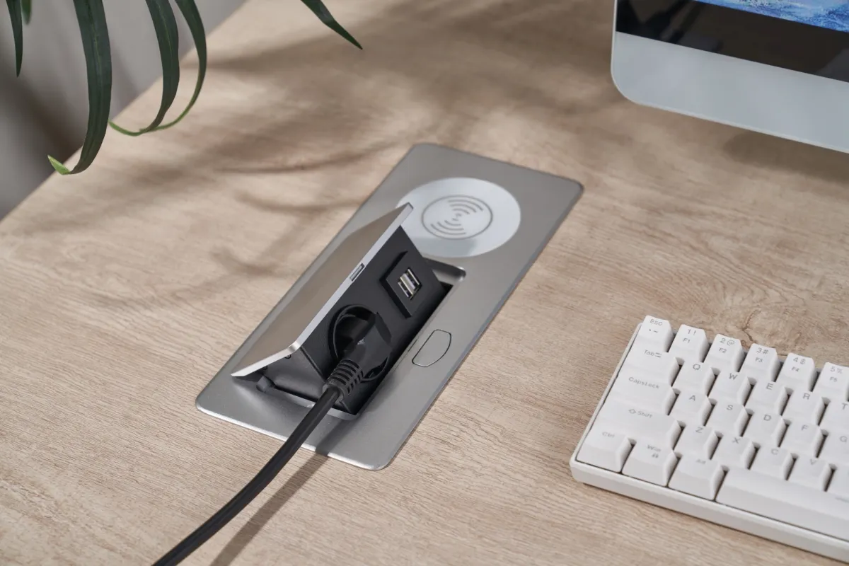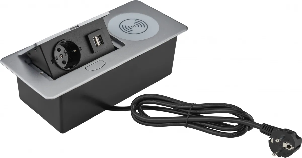 Выдвижная встраиваемая розетка CS-SOCKET-USBA-WLESS. Оснащена разъемом USB-A и индуктивным зарядным устройством. -