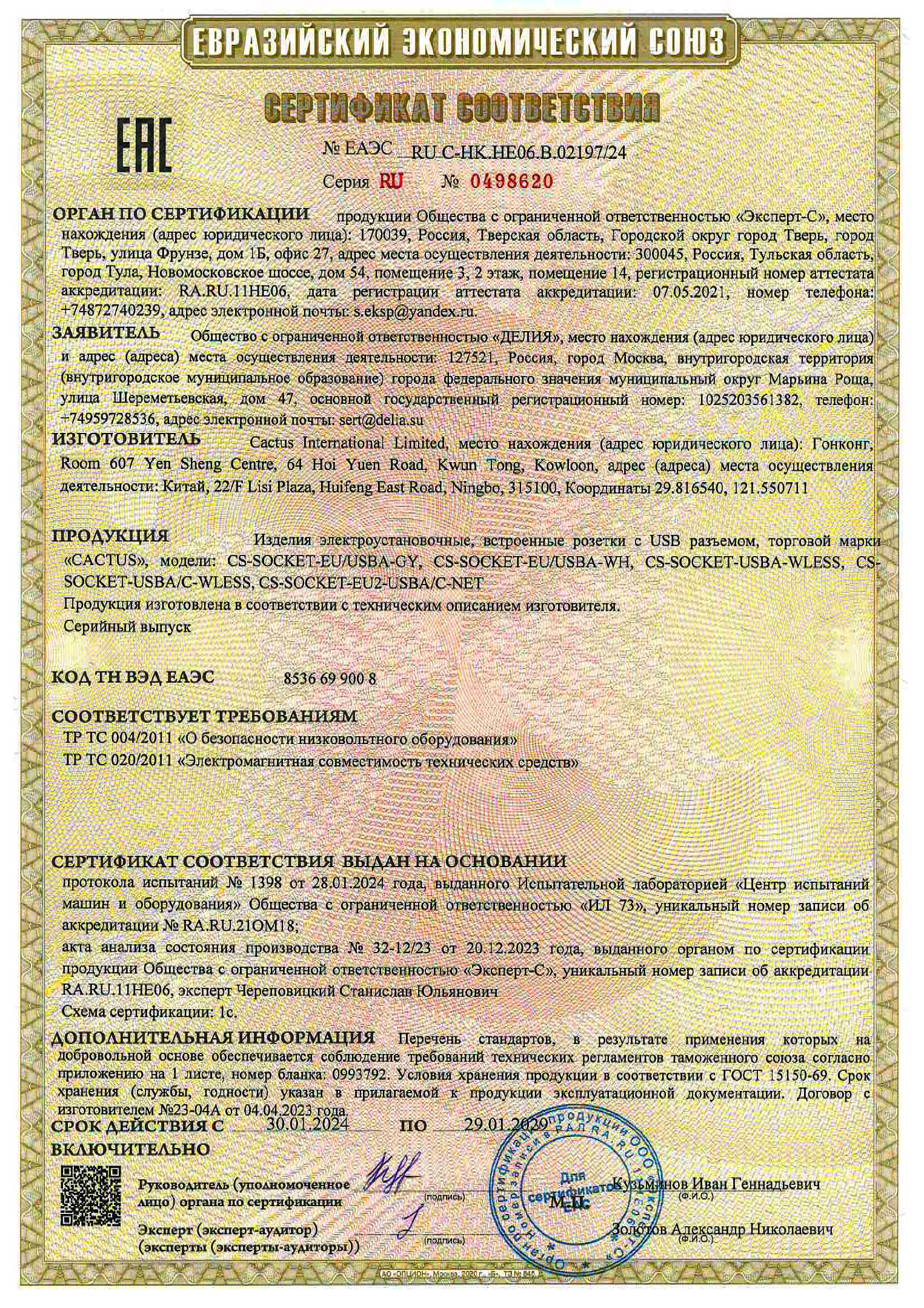 | Розетка Cactus CS-SOCKET-EU/USBA-WH для столешницы 26.5x11.8x6.5см белый | ЕАЭС RU С-HK.НЕ06.В.02197/24 | 29.01.2024 | 28.01.2029 |