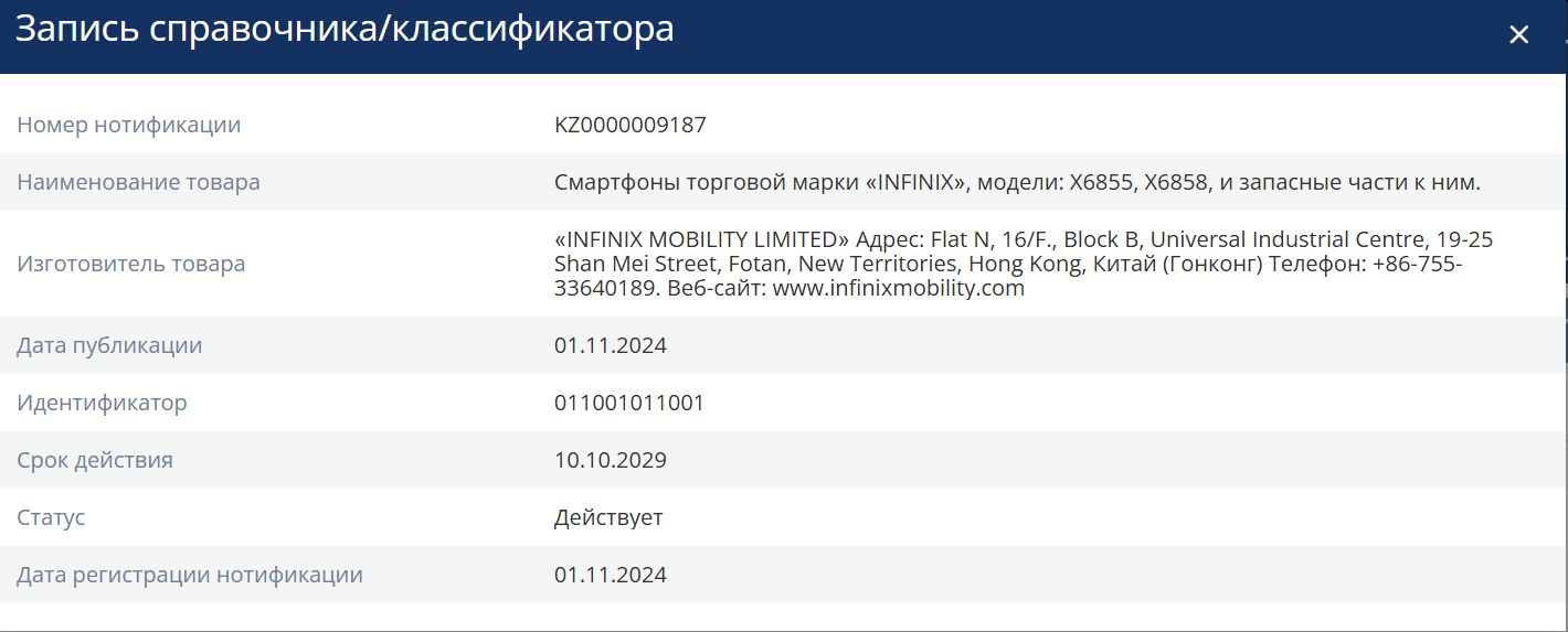 | Смартфон Infinix X6858 Note 50 256Gb 8Gb серый титан моноблок 3G 4G 2Sim 6.78" 1080x2436 Android 15 50Mpix 802.11 a/b/g/n/ac NFC GPS GSM900/1800 GSM1900 Protect FM | НИП KZ .ФСБ.0000009187 | 31.10.2024 | 09.10.2029 |