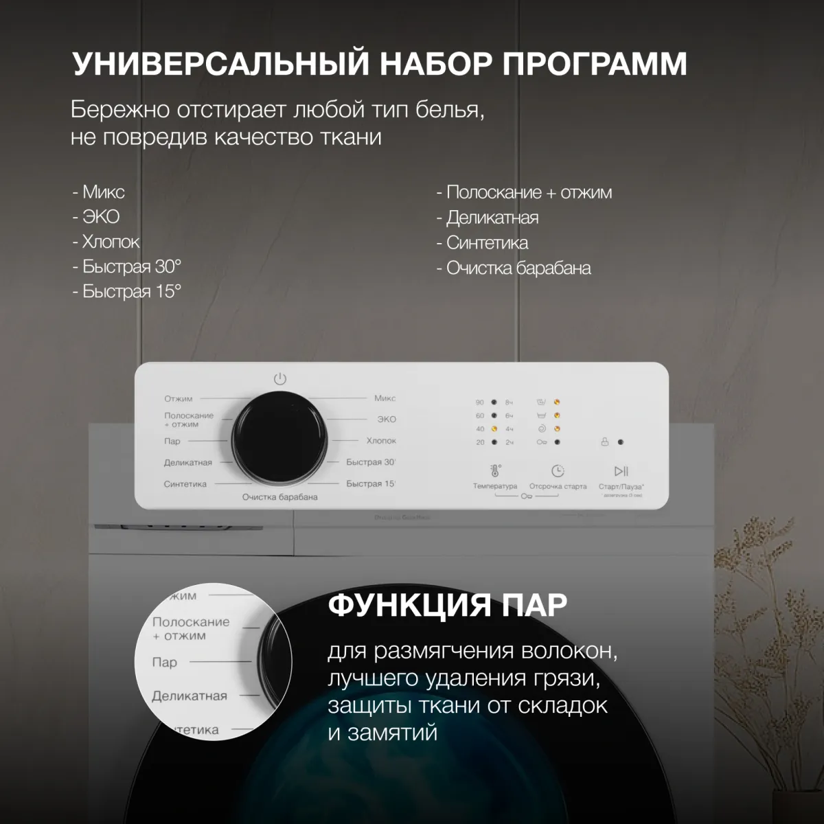 дисплей, защита от детей, сенсорная панель управления, таймер отсрочки запуска -