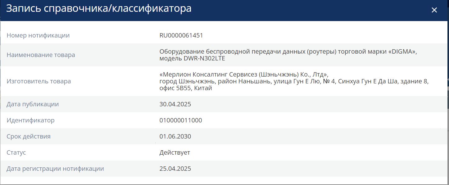 | Роутер беспроводной Digma DWR-N302LTE N300 10/100BASE-TX/3G/4G cat. 4 черный | НИП RU .ФСБ.0000061451 | 24.04.2025 | 31.05.2030 |