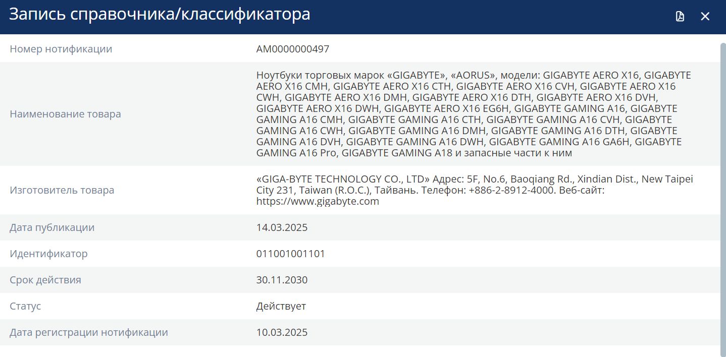 | Ноутбук Gigabyte GAMING A16 GA6H Core i5 13420H 16Gb SSD512Gb NVIDIA GeForce RTX5050 8Gb 16" IPS WUXGA (1920x1200) FreeDOS black WiFi BT Cam (CTHH3KZ893SD) | НИП AM .ФСБ.0000000497 | 09.03.2025 | 29.11.2030 |
