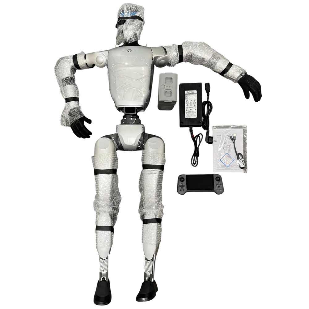 Робот, документация, зарядное устройство, аккумулятор (опция), комплект внешних кабелей (2шт), кабель USB-C (1шт), сенсоры мощности для опор (4шт), рама для настройки и калибровки (1шт) опционально, джойстик (опция), европейская вилка (опция), ручка для п -