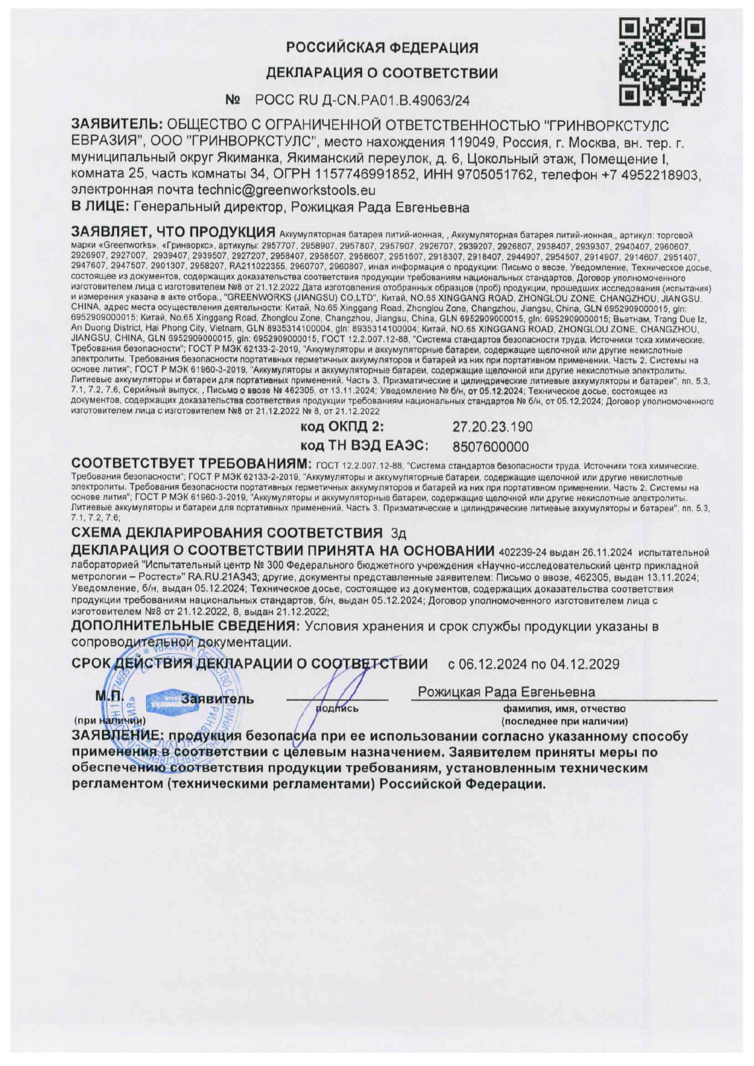 Батарея аккумуляторная Greenworks G40HP4 40В 4Ач Li-Ion (2958507)