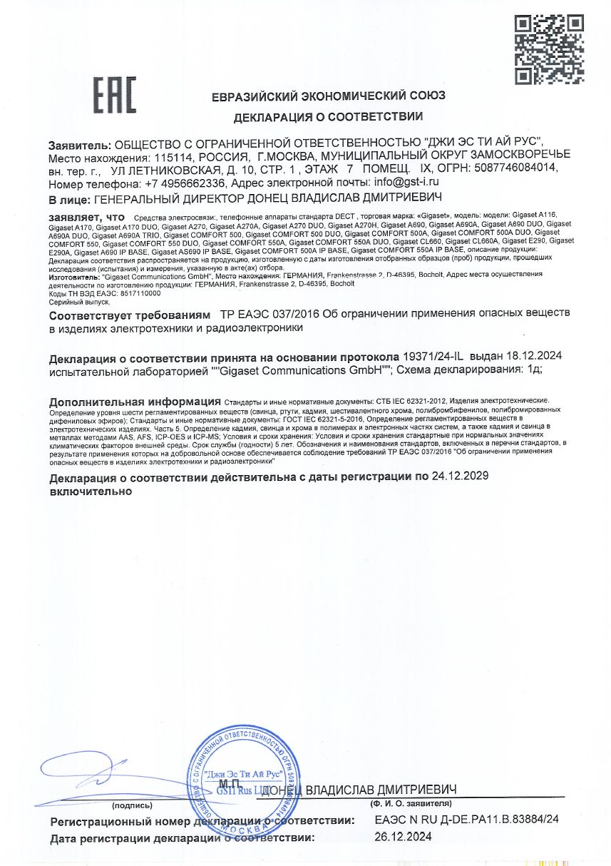 ЕАЭС N RU Д-DE.РА11.В.83884/24 | 25.12.2024 | 23.12.2029 |