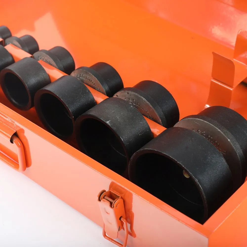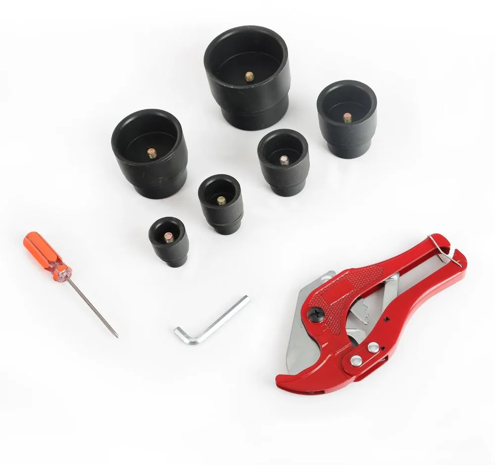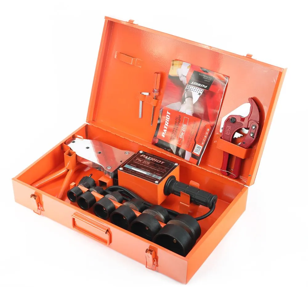 Паяльник для труб, подставка; резак для труб; насадки с диаметрами: 20, 25, 32, 40, 50 и 63 мм.; металлический кейс. -