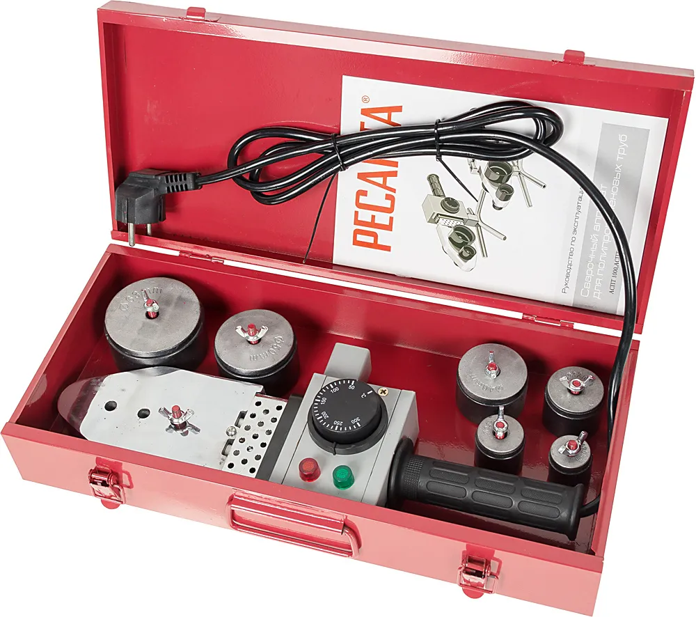 Сварочный аппарат для пластиковых труб; насадки (диаметр 20, 25, 32, 40, 50, 63 мм) - 6 пар; подставка под сварочный аппарат; руководство по эксплуатации; ключ имбусовый; кейс. -