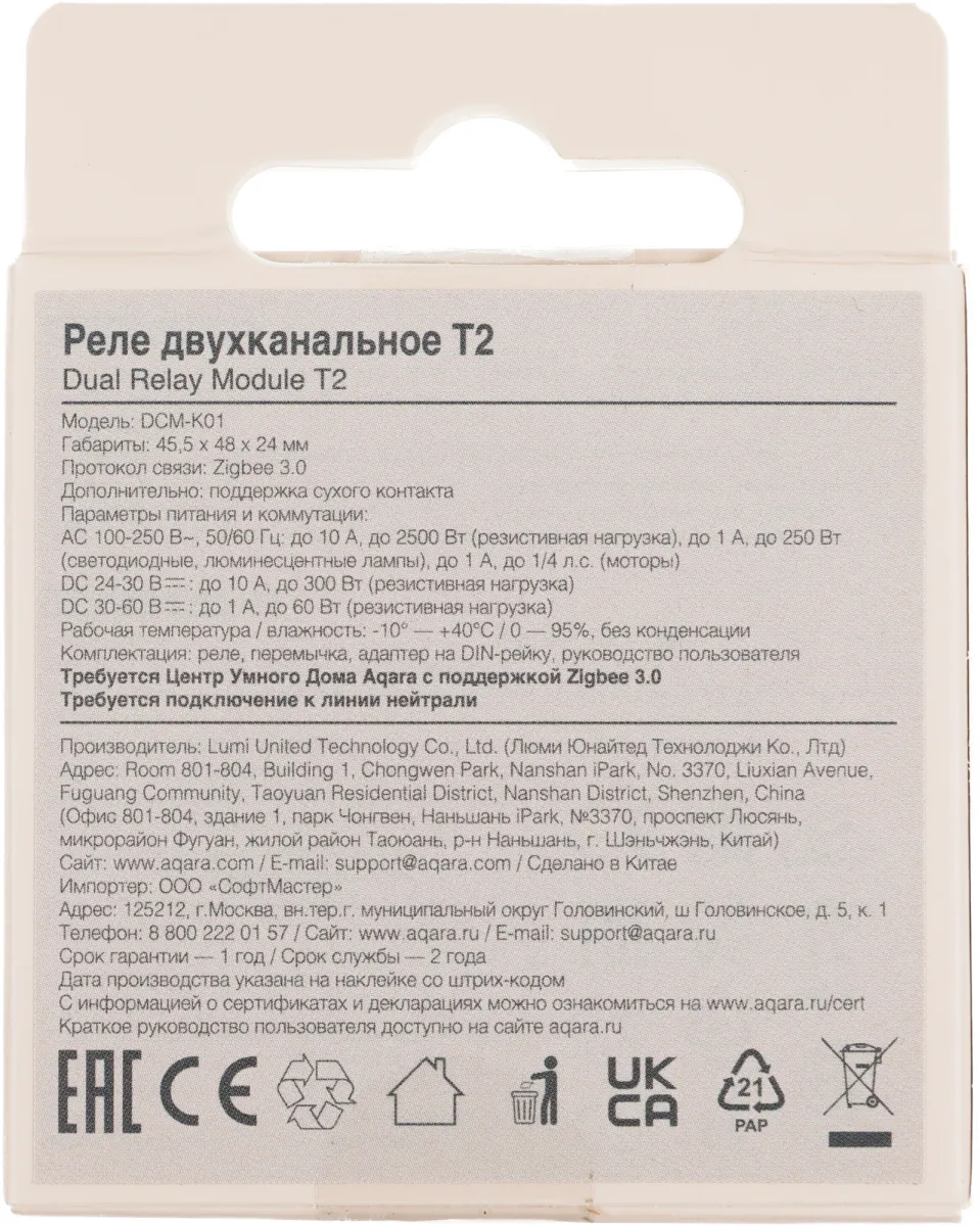 Умное реле Aqara T2 2канал. ДА (DCM-K01)