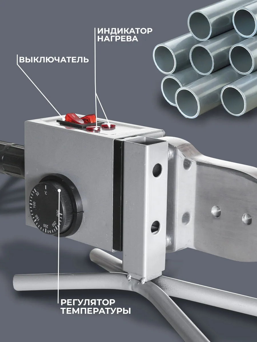 Сварочный аппарат 1 шт. Насадки (диаметр 20,25,32,40,50,63) 6 пар Подставка под сварочный аппарат 1 шт. Руководство по эксплуатации 1 шт. Отвёртка 1 шт. Ключ имбусовый 1 шт. Кейс 1 шт. Рулетка 1 шт. Ножницы для резки труб 1 шт. Спилковые перчатки -