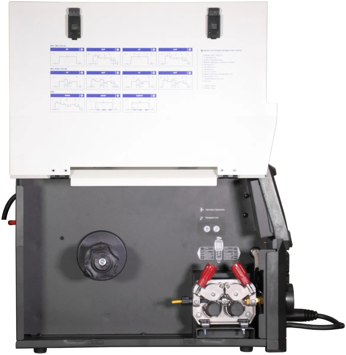 Сварочный аппарат, руководство по эксплуатации, кабель заземления с зажимом массы, горелка для полуавтоматической сварки, 3 м., кабель с держателем электрода, газовый рукав. -