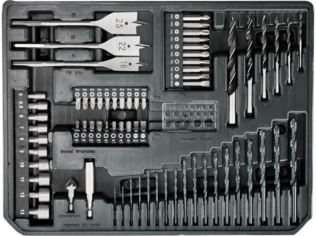 Биты 25 мм. 20 шт.; биты 50 мм. 10 шт.; головки торцевые 10 шт.; сверло по дереву перовое 3 шт., сверло по дереву спиральное 6 шт., сверло по металлу 18 шт., зенкер, держатель бит магнитный, шаблон, кейс -